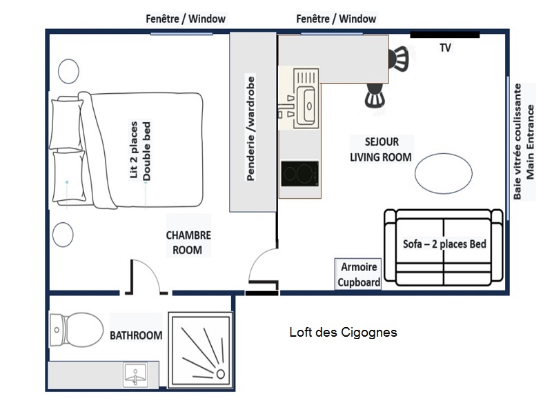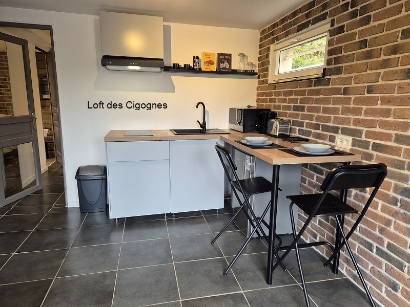 - Séjour avec Cuisine équipée : four Micro-Onde/grill , plaques induction, réfrigérateur, cafetière, grille-pain et ustensiles de cuisine.
