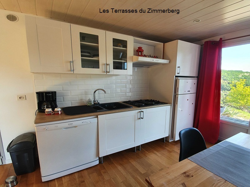 -Séjour avec Cuisine équipée : four Micro-Onde/grill , plaques à gaz , réfrigérateur-congélateur, cafetière, grille-pain et ustensiles de cuisine.